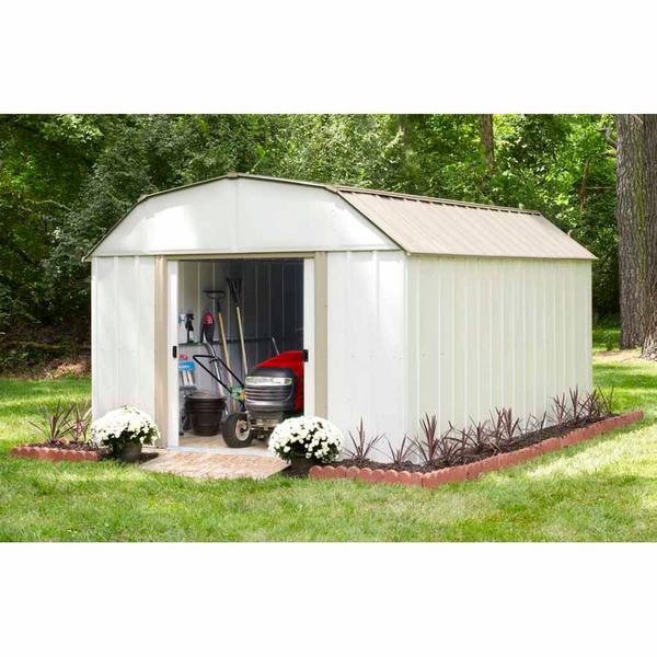 Styled with eggshell colored walls and coffee colored trim on its roof and doors this appealing storage building is great for storing patio equipment seasonal.